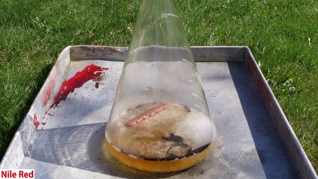 Piranha solution is nasty stuff. Composed of part sulfuric acid and part hydrogen peroxide, it eats through most organic matter with ease, and this hot dog shows that it’s frighteningly good at its job. So why does this video have some Explosions In The Sky-type post-rock music playing over it?