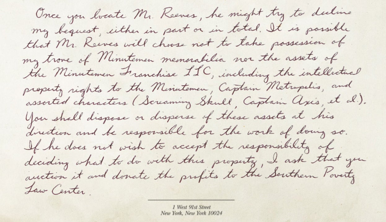 The will shows that following the Minutemen’s dissolution, Nelson came to see that he was wrong for keeping the rest of the group from supporting Will, and while he could never change what he did, he attempted to make things right by bequeathing Will his sizable estate—including all of the intellectual property rights to the Minutemen, which raises some interesting questions.