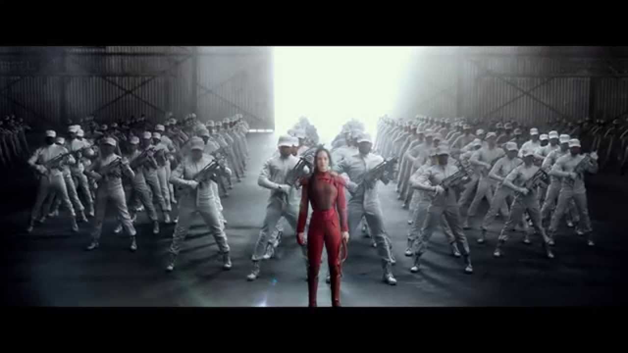 Katniss shoots an arrow down the street and all this fire and stuff pops out. “Welcome to the seventy-sixth Hunger Games,” Finnick jokes. Katniss is shown leading a huge mass of people down the middle of the capital, the same place they came in in the first two movies. “We’ve got one shot—lets make it count,” Gale saya. Then we get a huge montage of action: Buildings falling, lots of fighting, arrows shooting, guns firing out of walls, weird mutants in the sewers. As this is happening, Peeta says “Our lives were never ours, they belonged to Snow. If you kill him Katniss, you end all of this. All of those deaths will mean something.” The action beats continue, falling oil, crazy things jumping out, then Katniss says “Turn your weapons to the capital. Turn your weapons to Snow.”