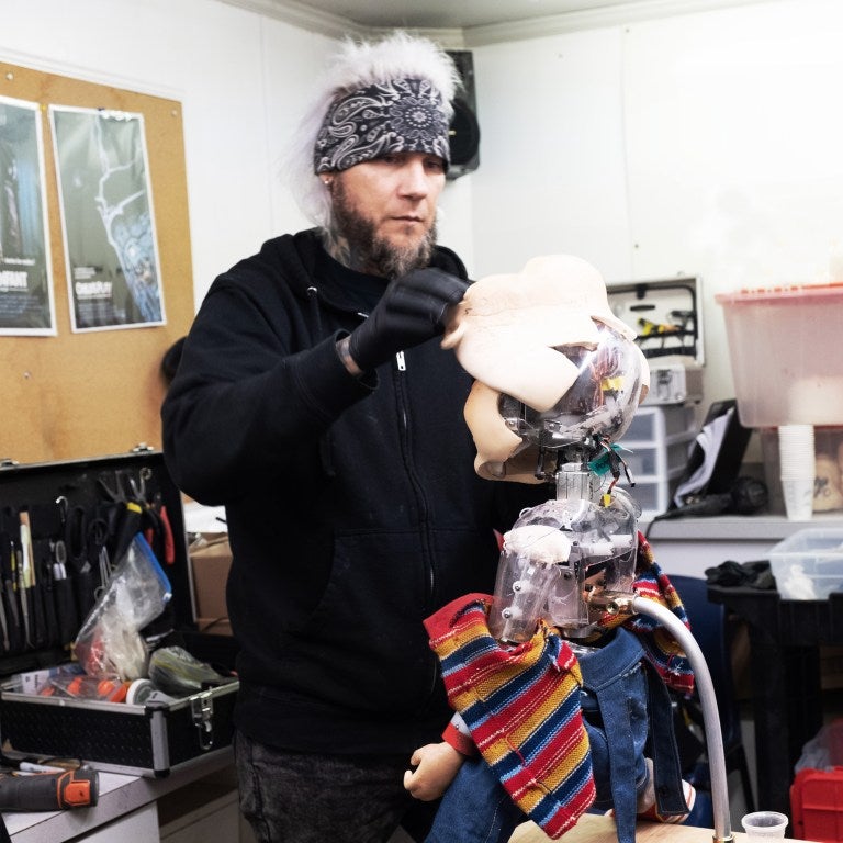 Bloody-Disgusting has a behind-the-scenes photo of the remake’s animatronic Chucky doll.