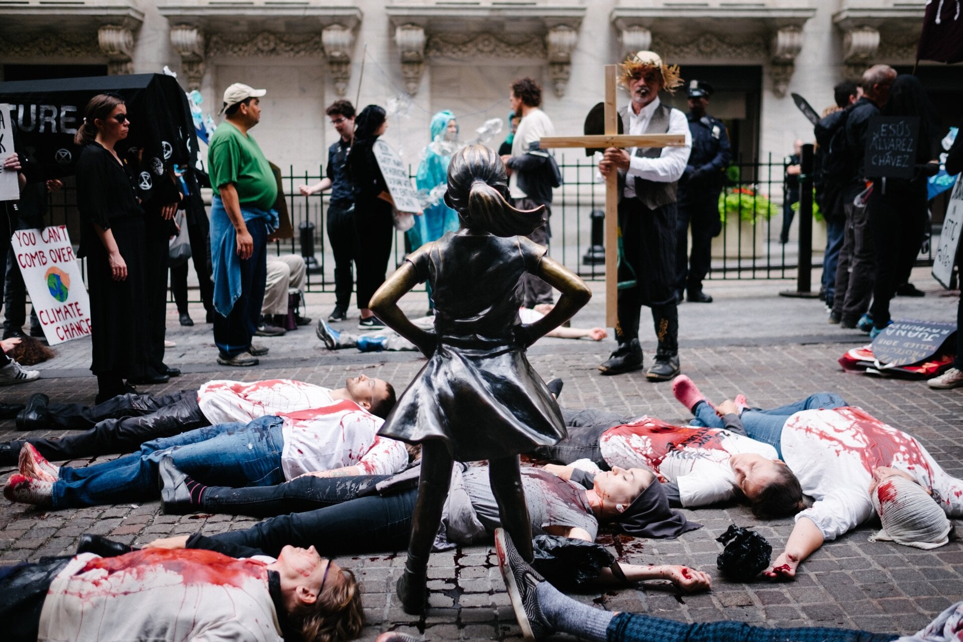 Farther into the heart of the Financial District, another group of Extinction Rebellion protesters splashed fake blood in front of the New York Stock Exchange. Towering above, the NYSE building stood adorned with a banner of the Golden State Warriors whose president rang the opening bell that morning to celebrate going public.