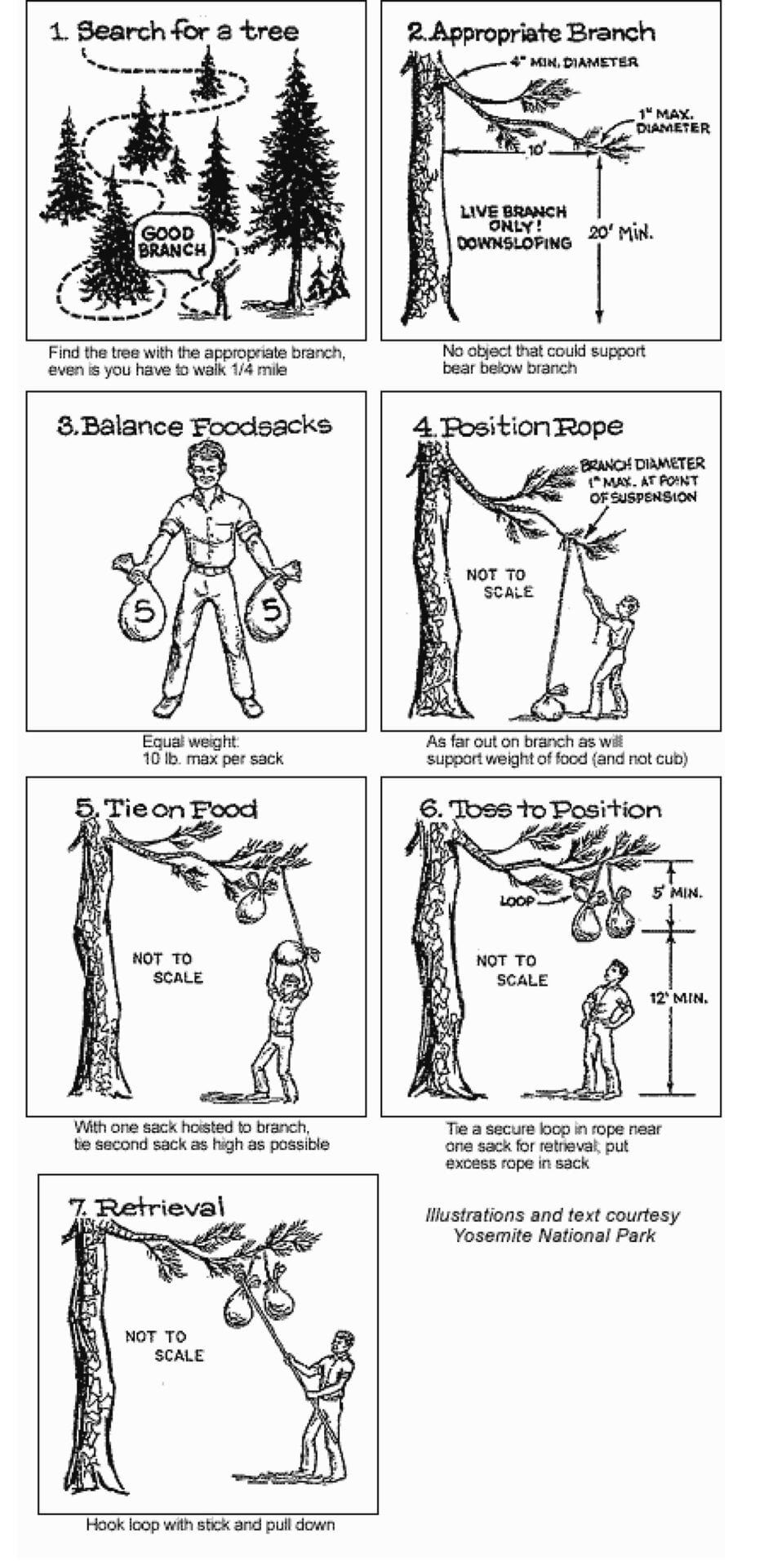 The general idea is to find a limb that’s far enough off the ground that bags hanging from it can’t be reached, even by a bear standing on its hind legs. That limb should also be thin enough that a bear can’t shimmy out onto it and long enough that you can hang the bags far enough from the trunk that the bears can’t reach them from there either.