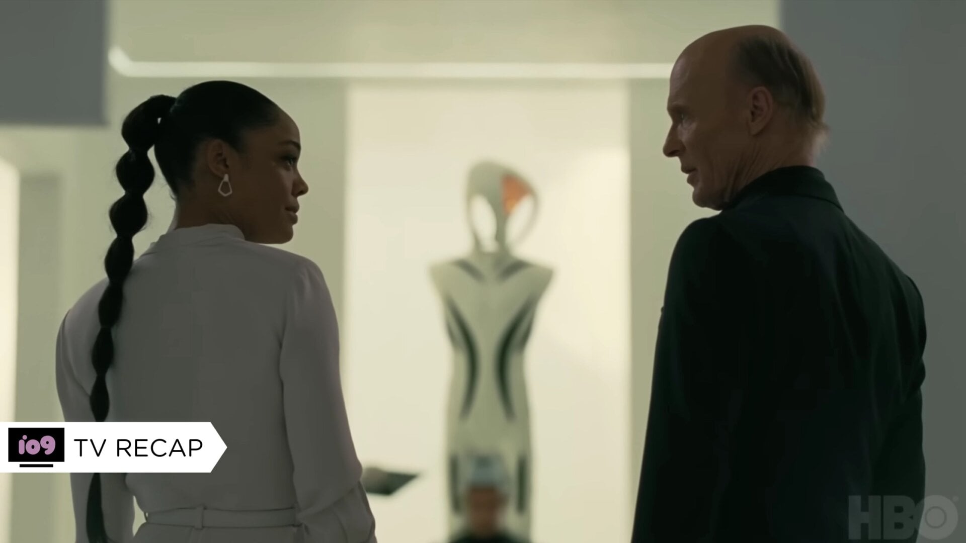 Although the role of the flies is still baffling—and extremely horrifying—and we don’t know exactly what Hale’s specifically planning, she does let us know what she’s hoping to achieve: to make a world where her “children” are safe from humans. She doesn’t want to kill all humans or replace all humans with Hosts, as that would be pointless—but she’ll kill as many humans in power and replace them with Hosts under her control as necessary. And she tells all this to the real William (or probably real William, but definitely the same William who decided his mission was to kill all Hosts and got his throat slit in the season three finale). He’s alive and thoroughly trapped in some kind of sci-fi suit held by one of the Host-making rings. And then Hale drugs him and puts him back Westworld’s equivalent of carbon freezing.