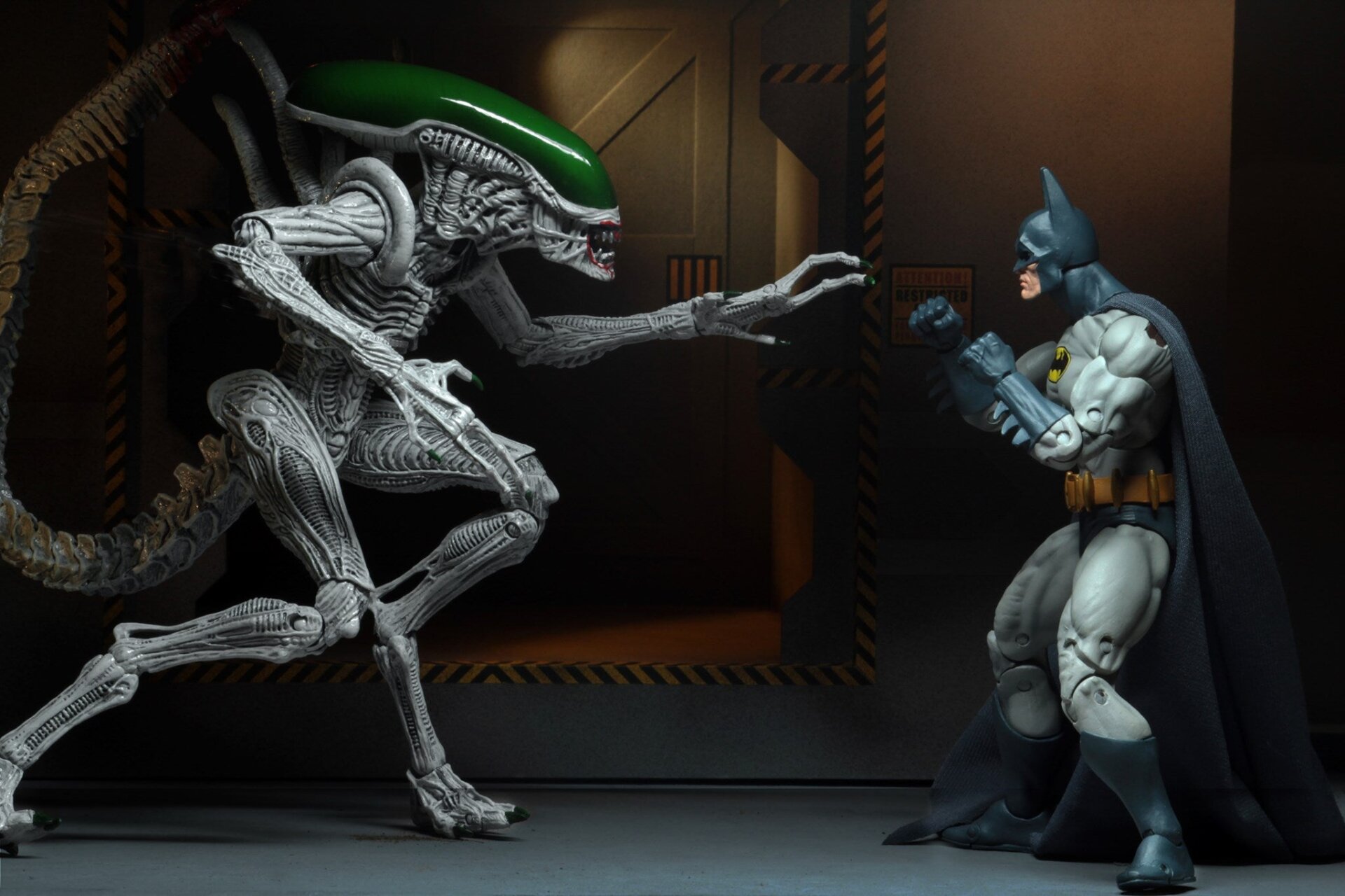 NECA got on board early by showing off a spiritual successor to its DC and Alien/Predator two-packs from San Diego, in the form of a new set recreating the events of the 1997 Dark Horse/DC followup crossover comic. In a scenario where xenomorphs have been created from the DNA of Batman’s most dangerous foes, the Dark Knight is forced to battle a sickly-white alien born from the Joker. Aside from the figures themselves, there’s not much in the way of accessories in the set—Batman has an alternate hand to pose him throwing a probably very useless-versus-aliens batarang, but the Joker Xenomorph does come with a bendable tail, all the better to jab Batman with. Ooh err. [Toyark]