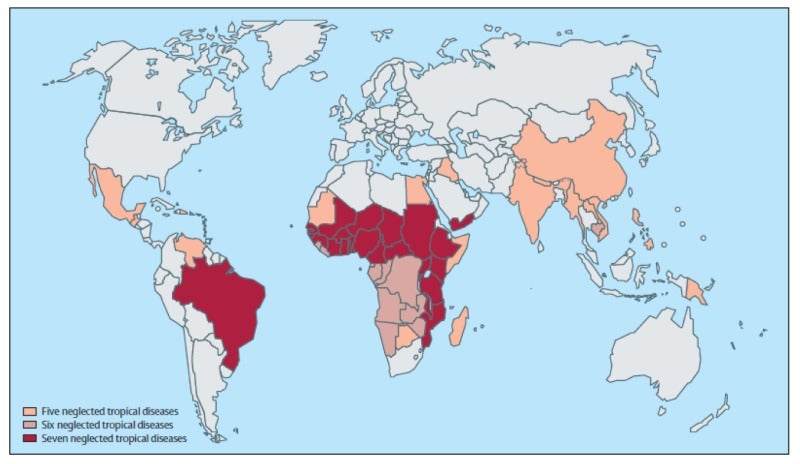Geographical overlap and distribution of the seven most common neglected tropical diseases: ascariasis, hookworm infection, trichuriasis, schistosomiasis, lymphatic filariasis, onchocerciasis, and trachoma (via Hotez et al. 2009).