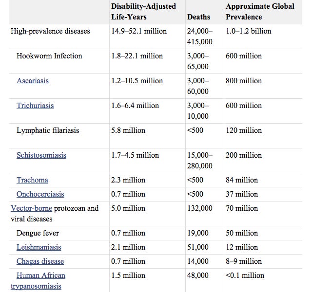These diseases also cause high morbidity — which is often difficult to measure — and fewer deaths than HIV/AIDS and malaria; the health effects of NTDs are less apparent.