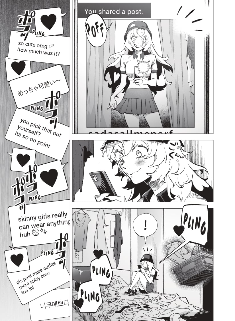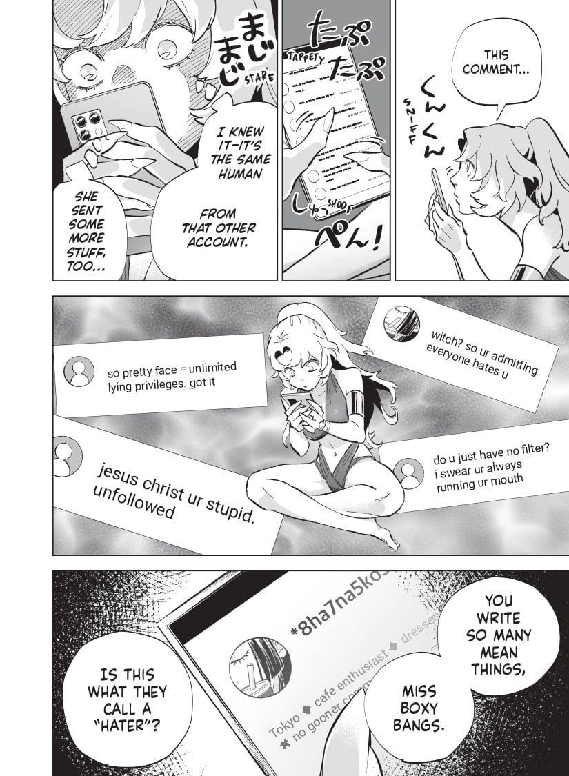 Wicked Spot, by Sal Jiang, follows Sadako, a witch sequestered in a haunted forest that only foolhardy livestreamers would ever venture into in the hopes of getting some good content out of it… which just so happens to be how the story starts out. After scaring the bejesus out of her intrusive houseguests, Sada notices that they dropped a smartphone (or as she calls it, a “glowing little board”) as they fled into the night. And like placing an iPad in front of a child and watching their little brains melt in real time at all the glowing colors, Sada immediately becomes mesmerized by the glamour of social media and all the pretty influencers sharing cute pics for likes. After years of feeling unseen, Sada decides to go into the city and become an influencer.