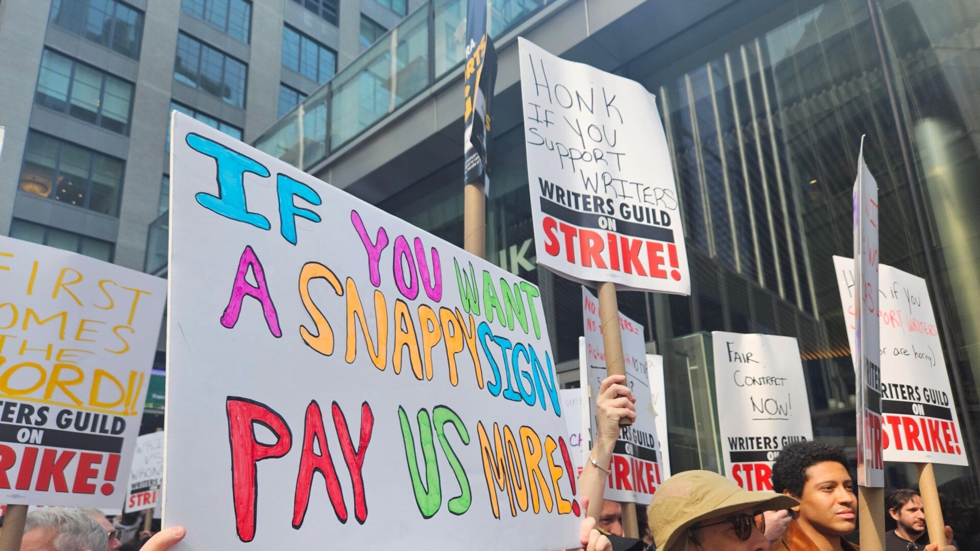 The scene at 33rd and 10th was anticipatory; everyone was ready for this. Earlier this week, in “the canyon” between the HBO offices and Amazon headquarters in New York City’s Hell’s Kitchen, a massive group of marchers picketed for nearly four hours in support of the Writers Guild of America. io9 was there talking to union members on the front lines.