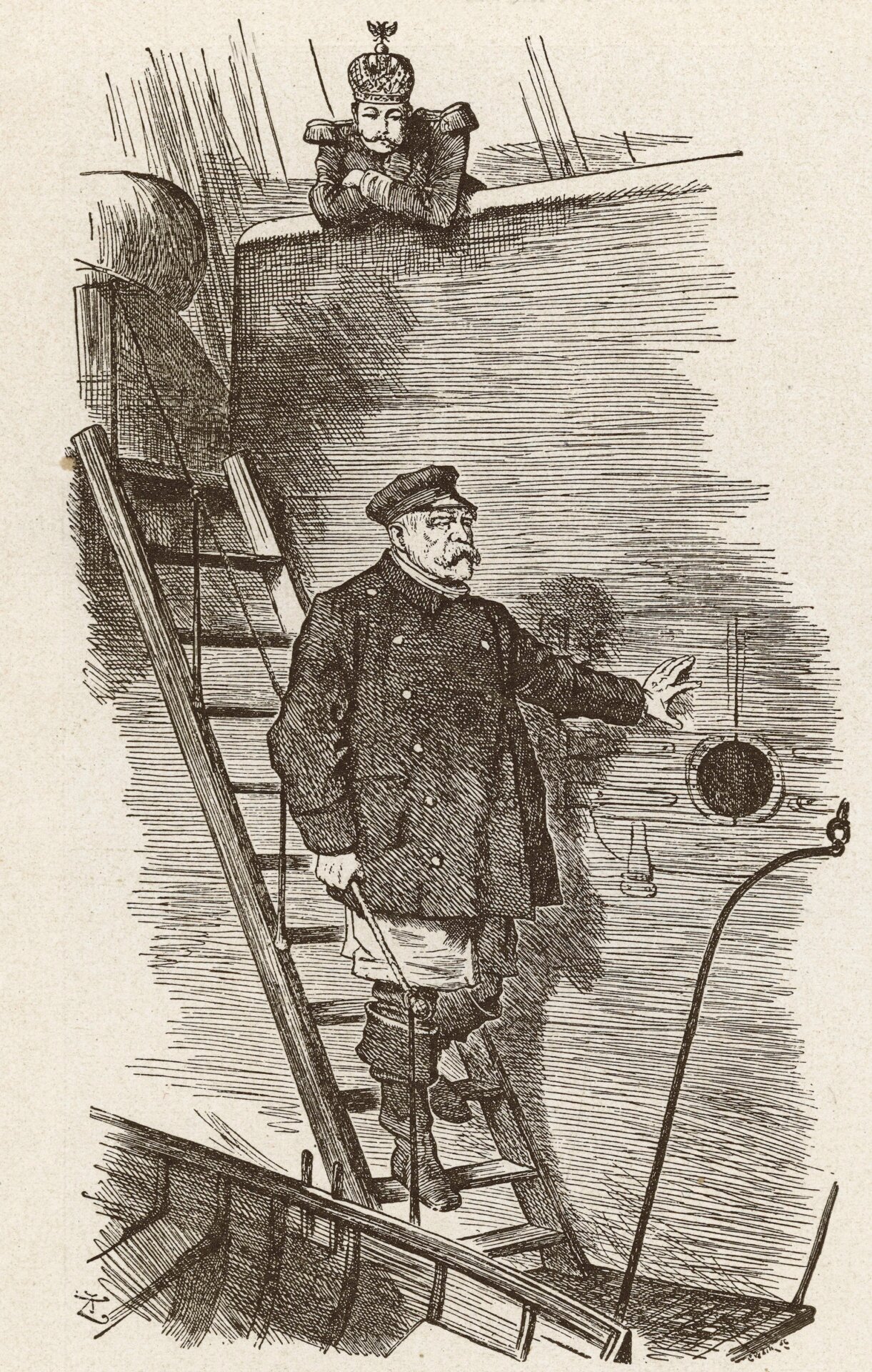 This Punch comic from 1892 chronicles the resignation of Otto von Bismarck. The old Chancellor is being pushed aside by the new Kaiser to make room for “Weltpolitik.”
