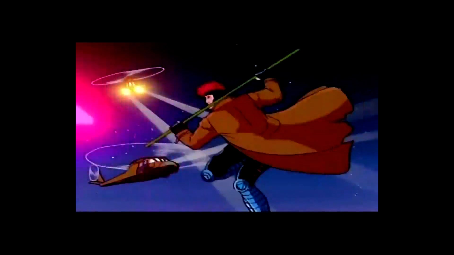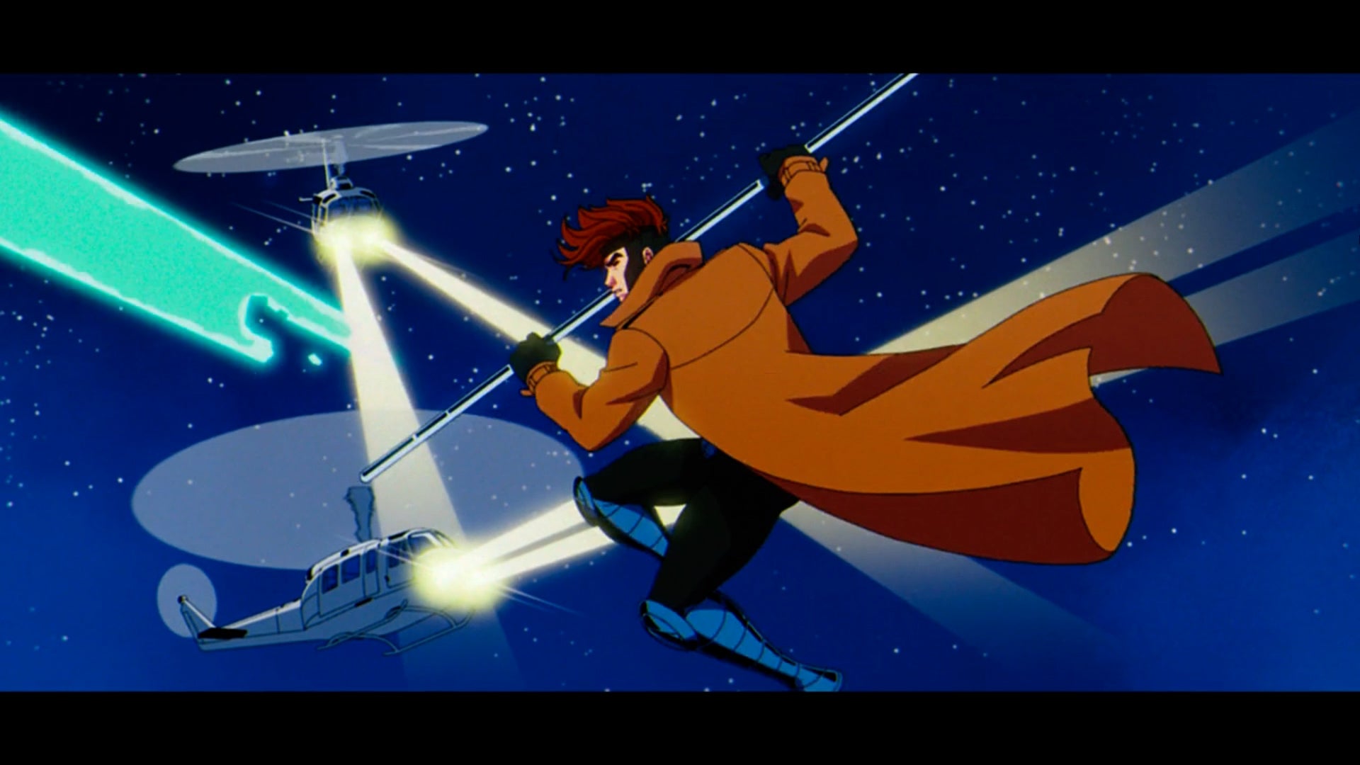 And another great remake sees Gambit surrounded by helicopters as he spins through the air, staff in hand.