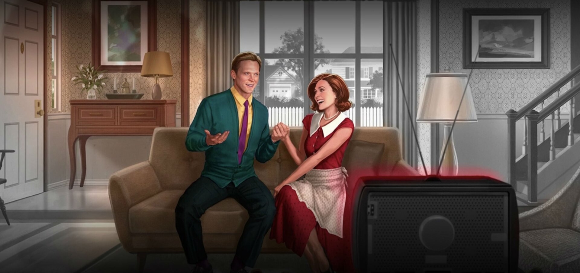 Next up is WandaVision, slated for a spring 2021 release. All that was revealed as this one image of Wanda and Vision in antiquated domestic bliss that looks like it could’ve been ripped right out of Tom King, Gabriel Hernandez-Walta, and Jordie Bellaire’s incredible comic series The Vision. This art had previously been seen as a poster released at the D23 Expo, but at least now we can get a much cleaner look at it—and those ominous shadows of Scarlet and Vision in the background.