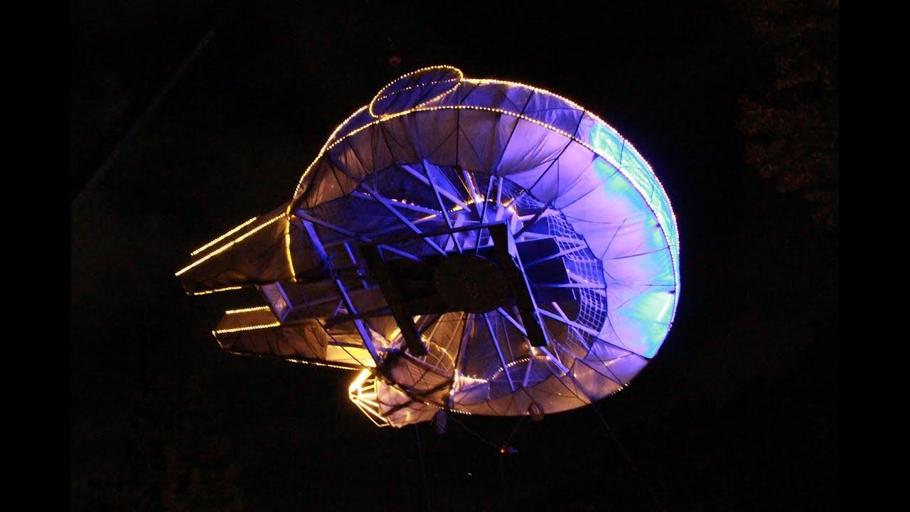 Make magazine has all the details of the entire build, which included lots of lumber, lots of PVC plumbing pipe, and an old parachute wrapped around the giant frame the family built. The final ship was nowhere near as heavy as the real Millennium Falcon must be, but it still required Powell to borrow a crane in order to lift the 700-pound holiday decoration onto the roof of his house.